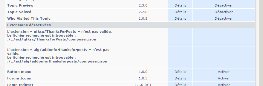 Aussi, je vois que durant la mise à jour de cette extension entre la version 3.0.5 et la version 3.0.6 il y a eu ce changement-ci : https://github.com/alg5/addonforthanksf ... 63aae14R20. Cela concerne le nom du répertoire de l’extension « Thanks for posts » qui est devenu depuis sa version 2.0.4