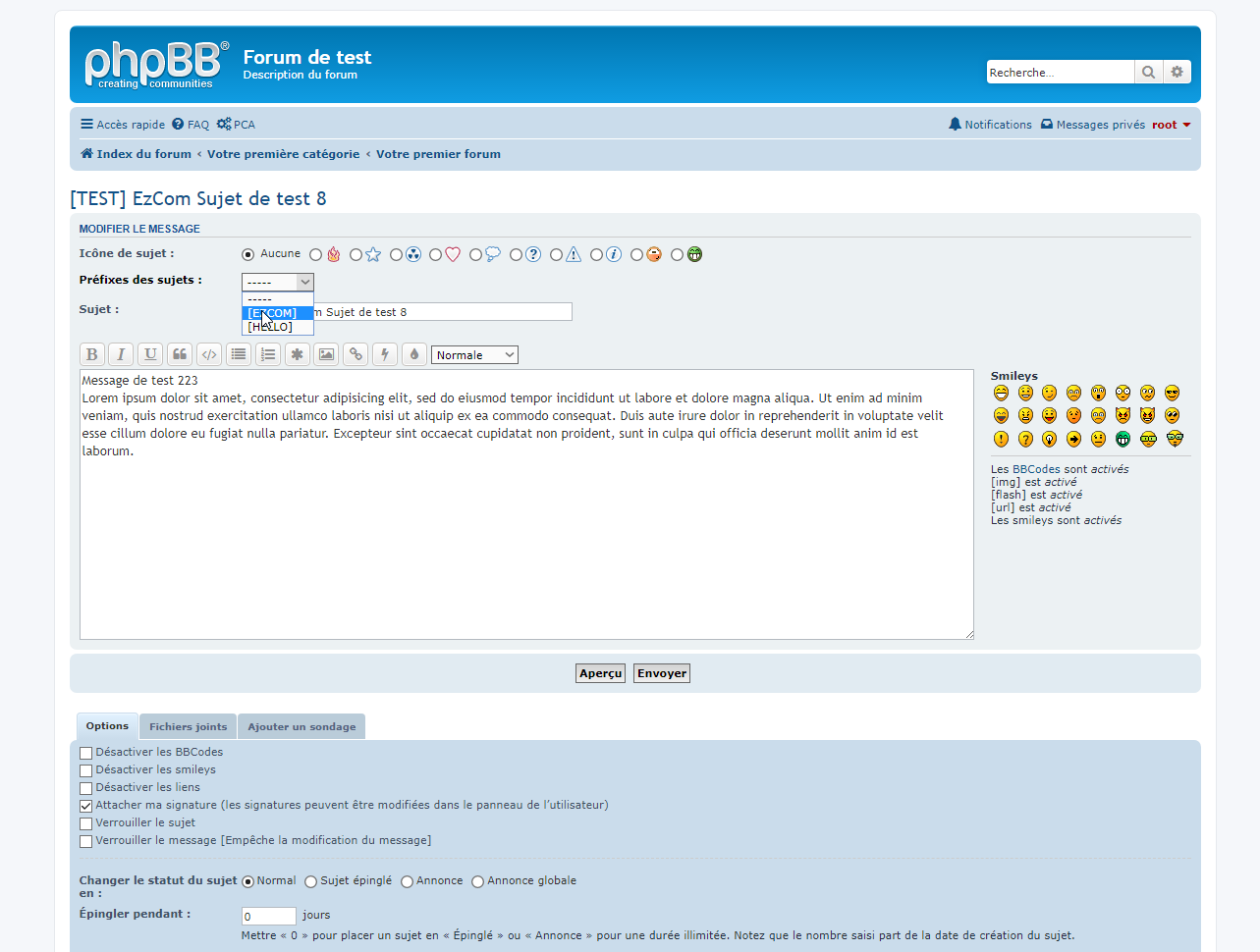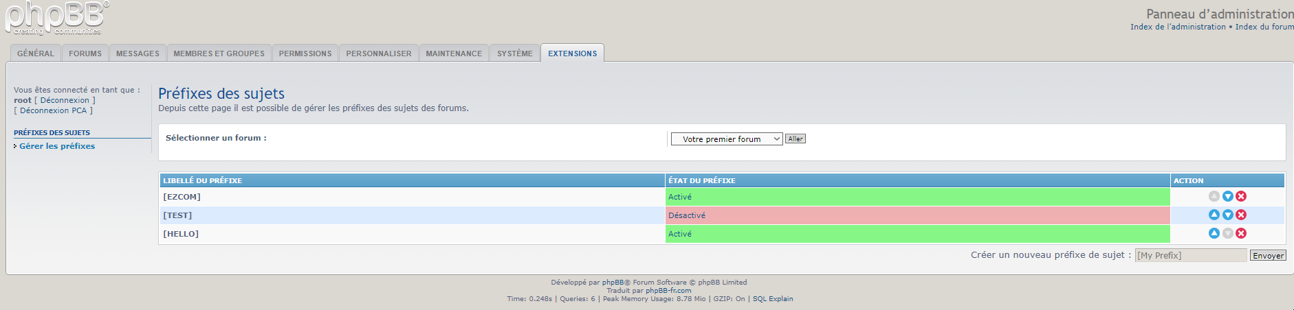 • Description : Cette extension pour phpBB 3.2.x permet d’ajouter un préfixe au sujet. il est possible de créer plusieurs préfixes pour chaque forums, mais un seul peut-être utilisé par sujet. Au système de permissions n’est pour l’instant disponible, l’extension est encore au début de son développement.