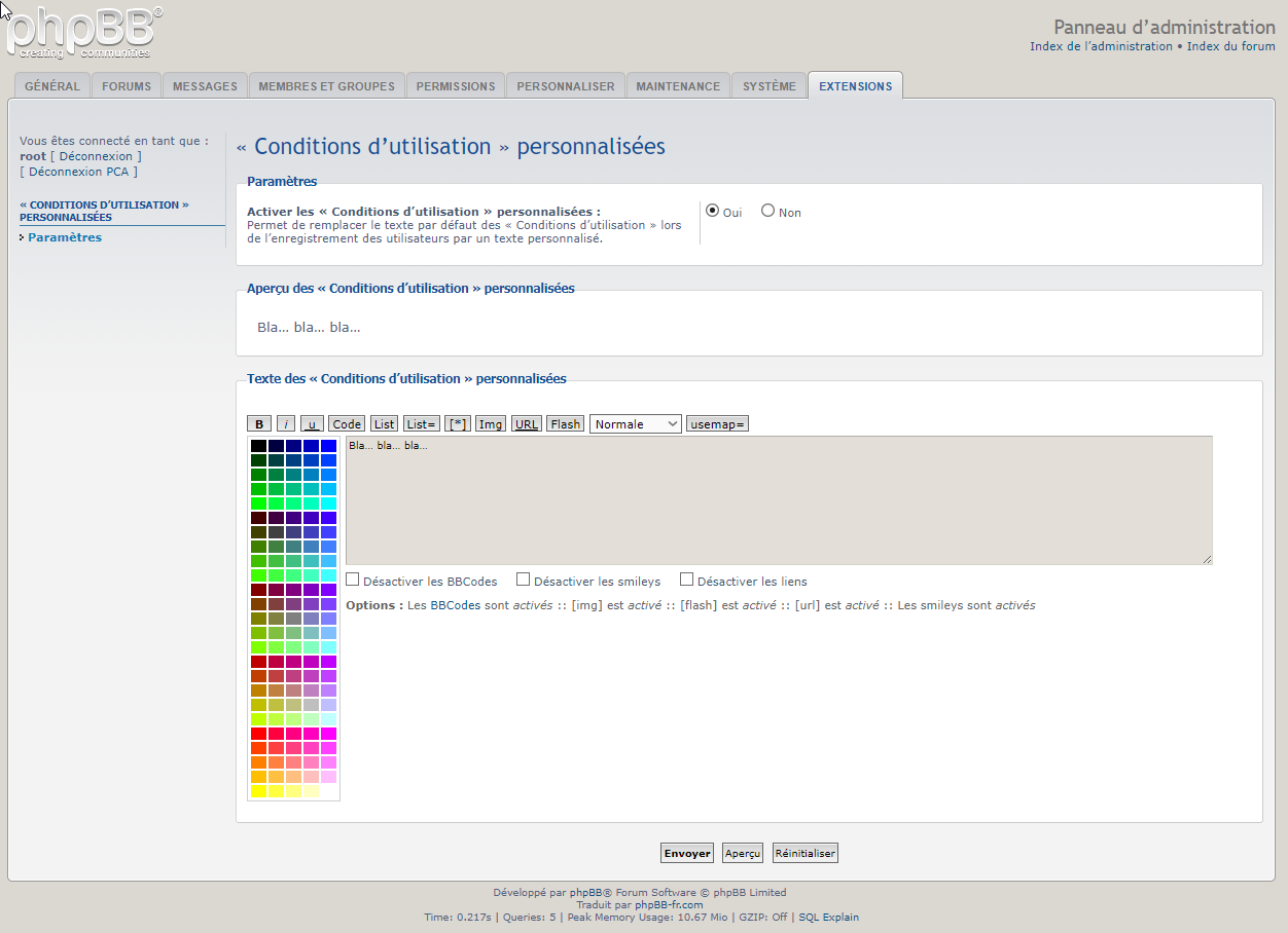 Permet de personnaliser le texte des « Conditions d’utilisation » depuis le panneau d’administration | Allows to customize the « Terms of use » text from phpBB ACP.