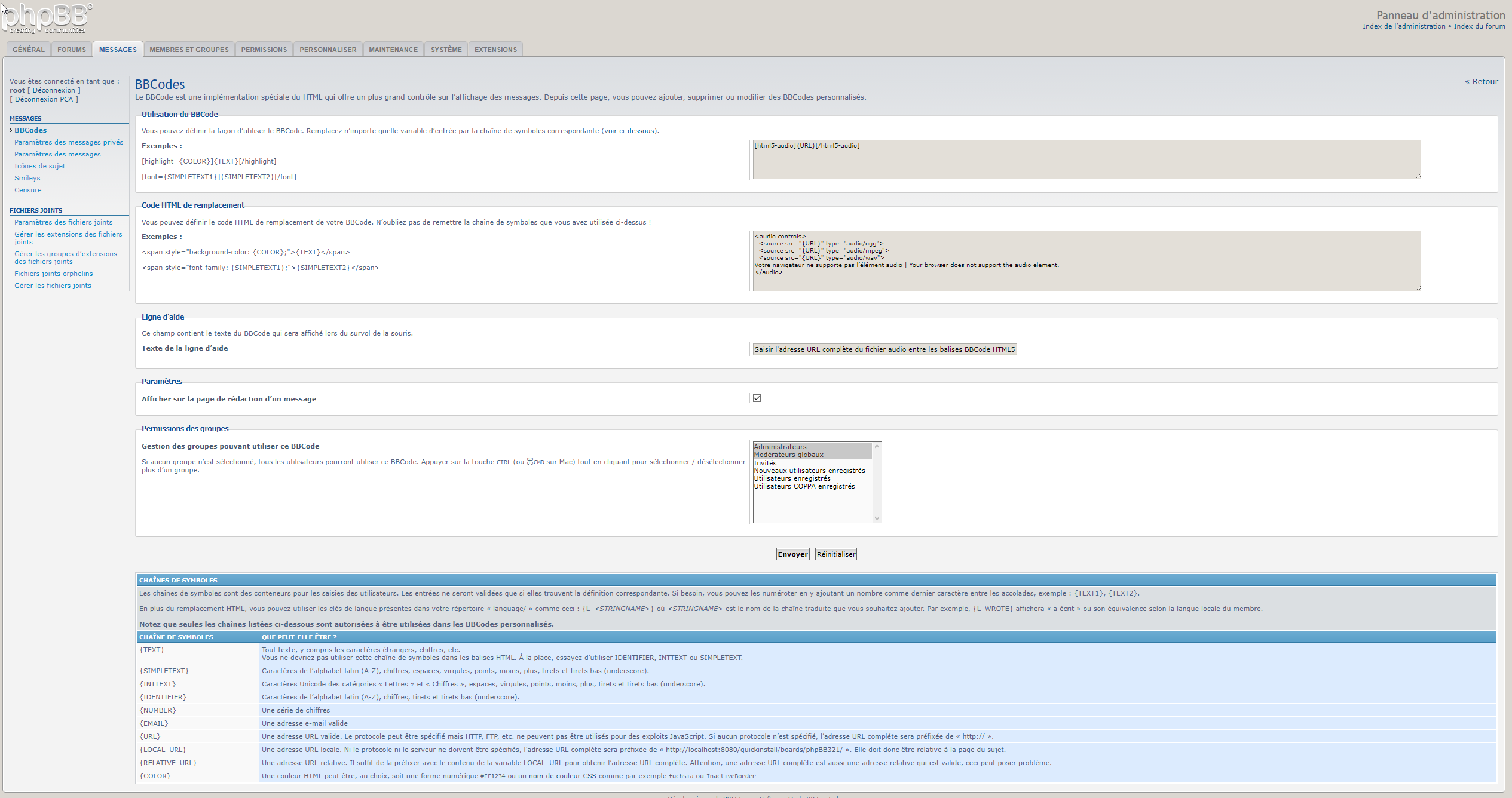 - Panneau d'administration - Vue de la page de gestion des BBCodes, création d’un nouveau BBCode HTML5-Audio :