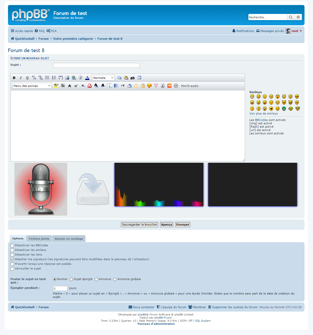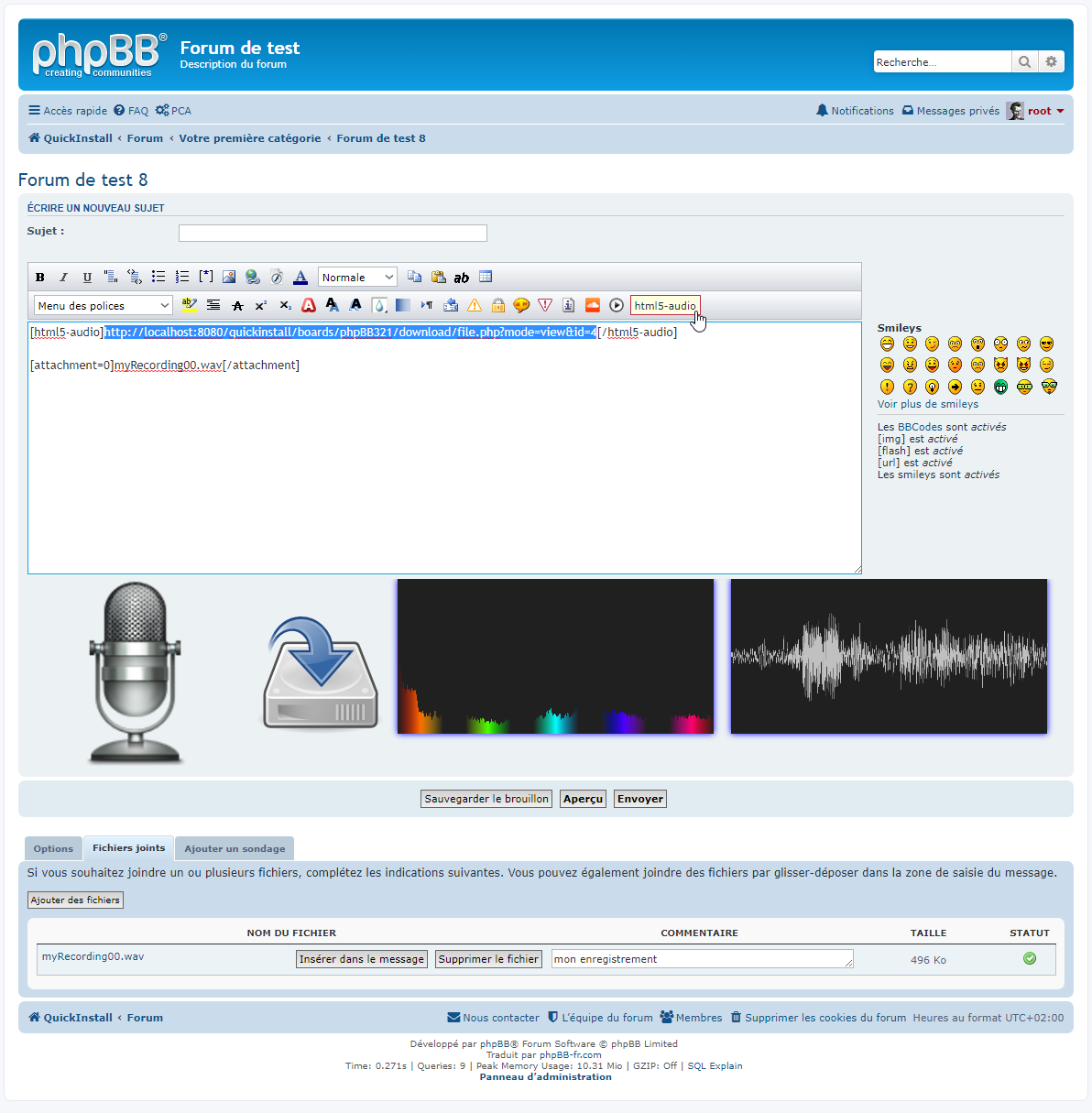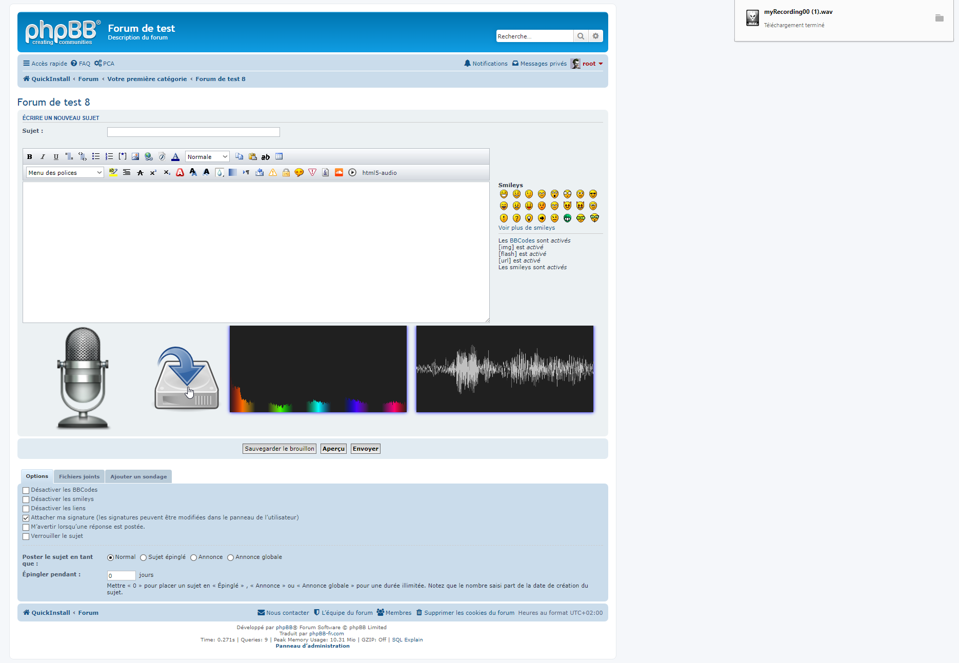 - Description : Cette extension pour phpBB 3.1.x & 3.2.x permet d’enregistrer sa voix depuis la page de rédaction d’un message et de télécharger l’enregistrement sous forme de fichier WAV. Depuis la même page il sera possible de joindre le fichier WAV puis de l’insérer dans le message au moyen du BBCode « Lecteur audio simple ». Voir un exemple du script sur cette page.