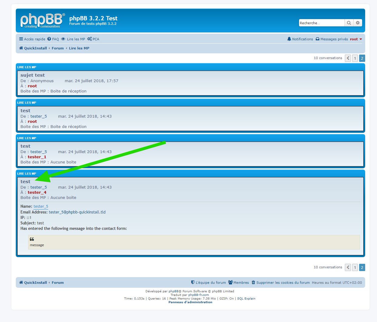 ► Description : Cette extension pour phpBB 3.1.x & 3.2.x permet de lister l’ensemble des messages privés du forum et de lire leur contenu. Par défaut seul le membre ayant l’ID 2 et ayant le statut de fondateur peut consulter cet outil.