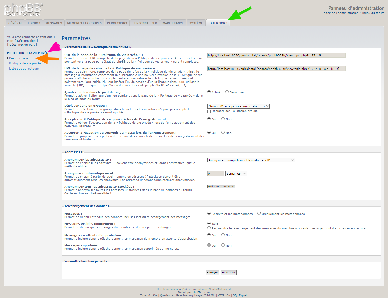 - Description : Cette extension pour phpBB 3.1.x & 3.2.x permet de personnaliser la « Politique de vie privée afin de la rendre conforme à la directive RGPD (GDPR 2018), d’anonymiser les adresses IP enregistrés dans la base de données du forum et de permettre aux membres de télécharger leurs données personnelles et leurs messages. Il est possible de :