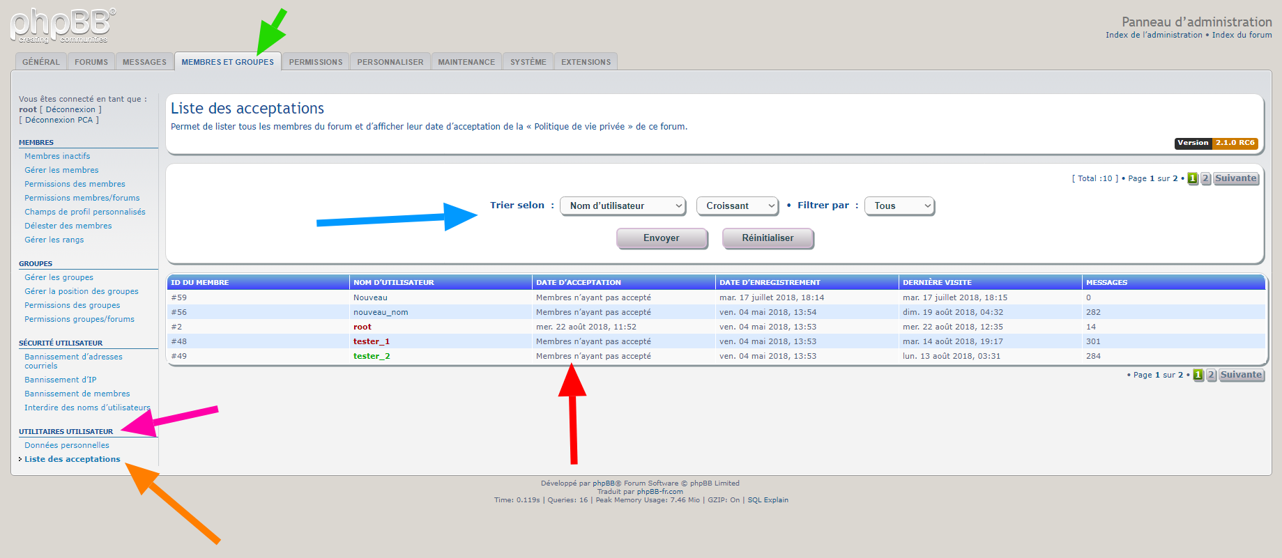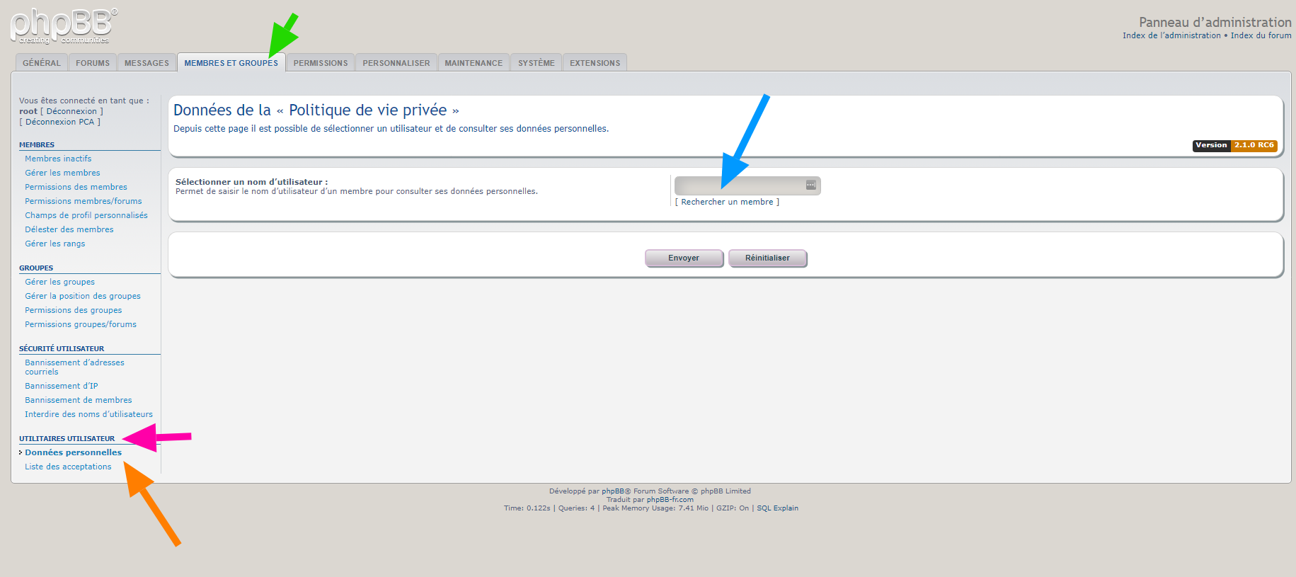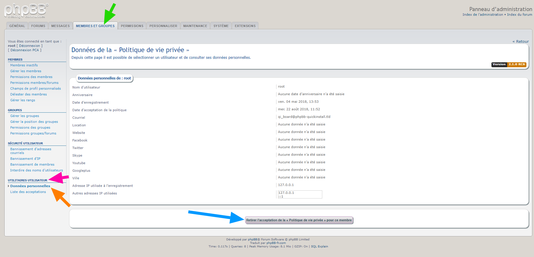 • lister tous les membres du forum et d’afficher leur date d’acceptation de la « Politique de vie privée » de ce forum,