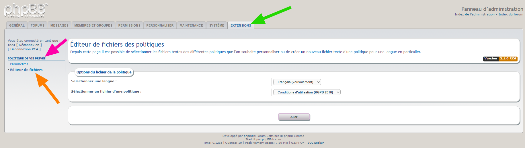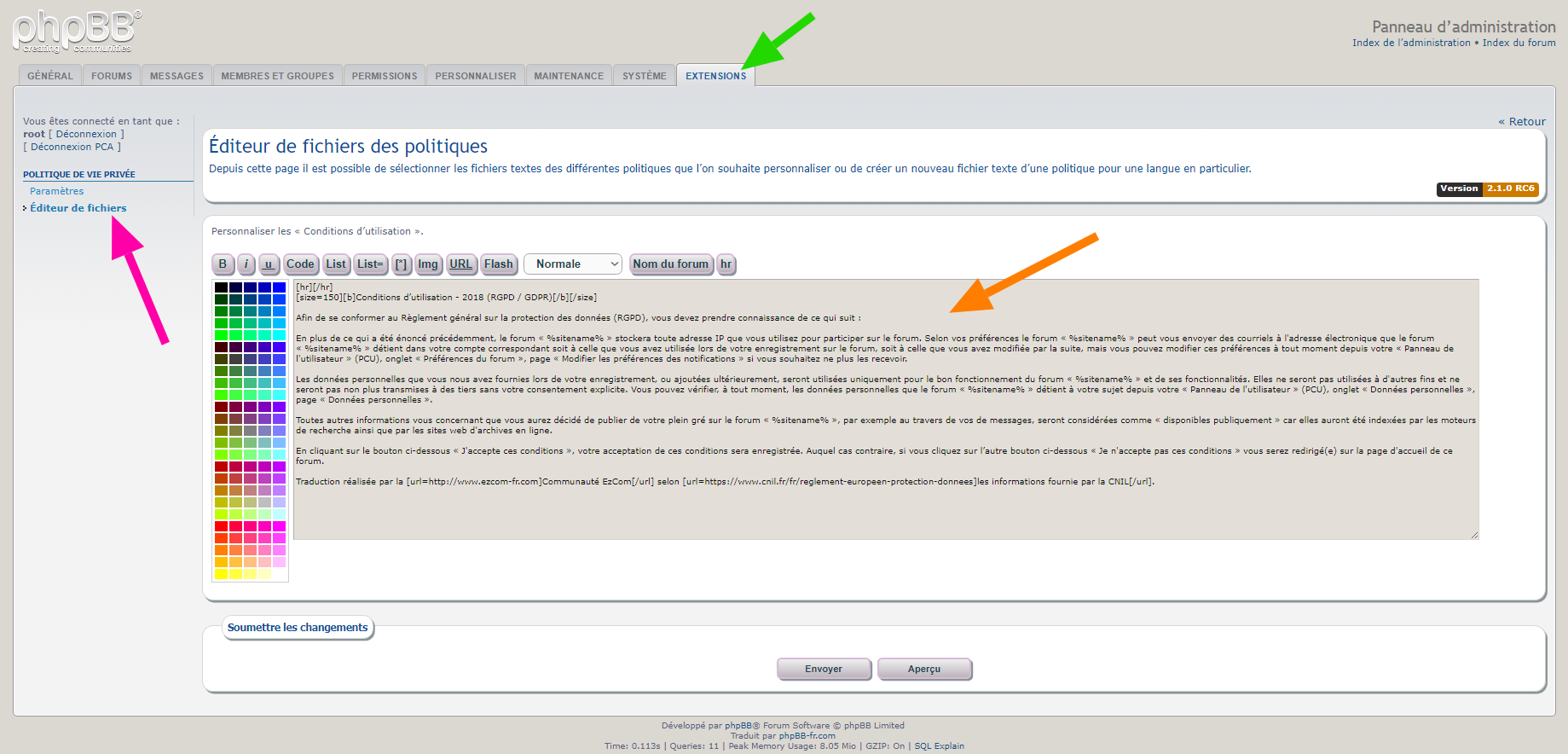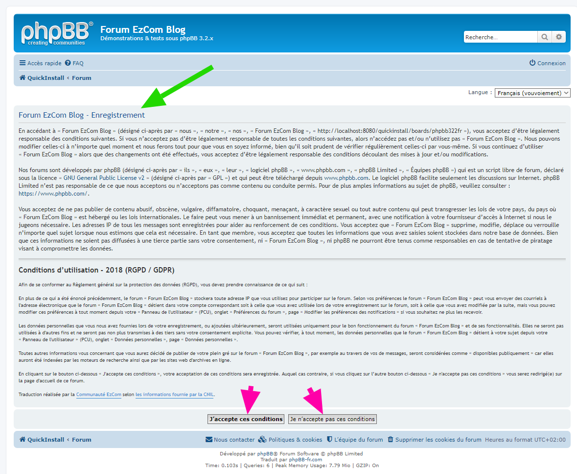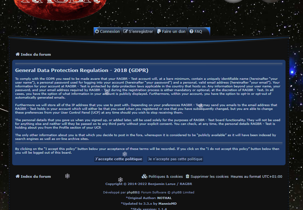 • activer / désactiver sur le forum l’acceptation de la « Politique de vie privée » concernant le Règlement général sur la protection des données (RGPD 2018),