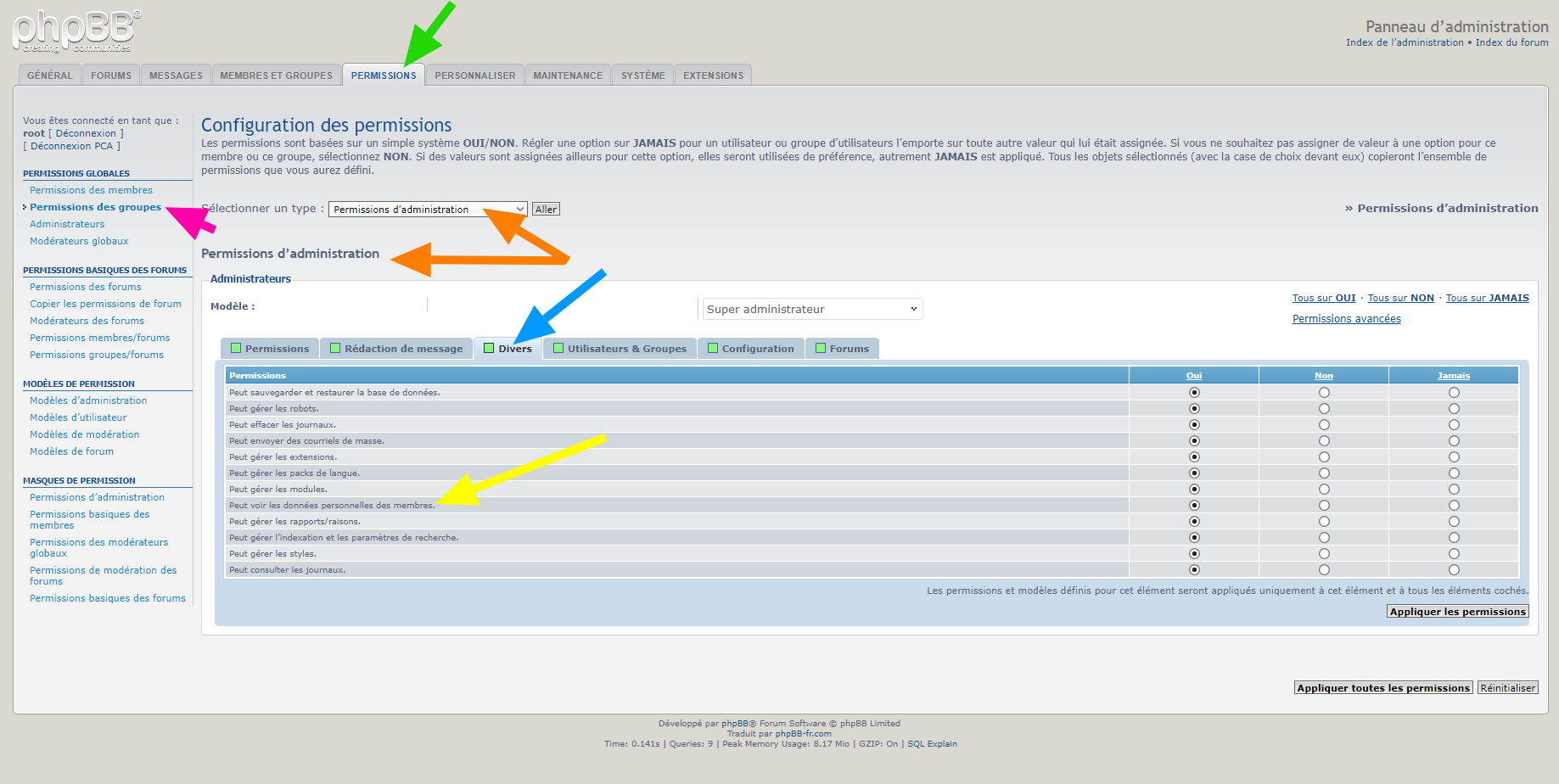 • Permission administrateur ajoutée :