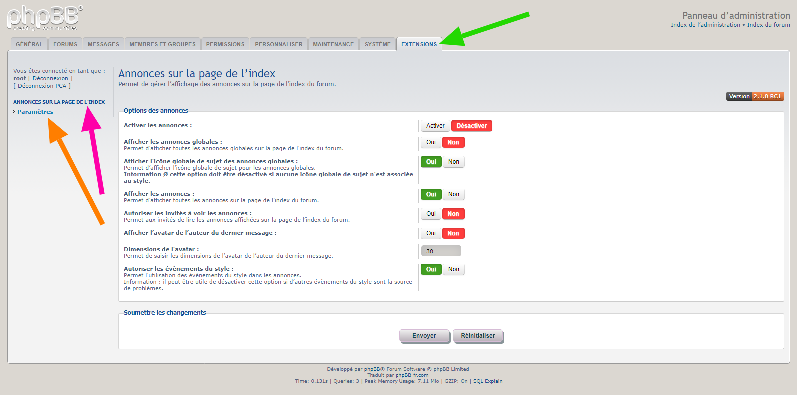 - Description : Cette extension pour phpBB 3.1.x & 3.2.x permet d’afficher les annonces simples et globales sur la page de l’index du forum. Il est possible de :