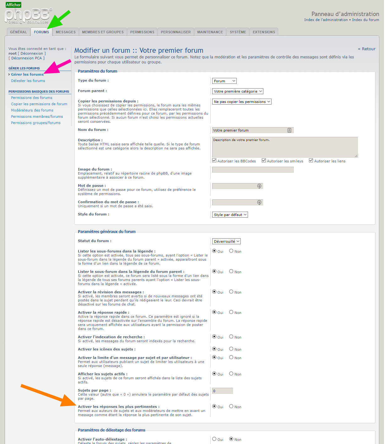 5. page « Modifier » (roue dentée verte correspondant à un forum) ;