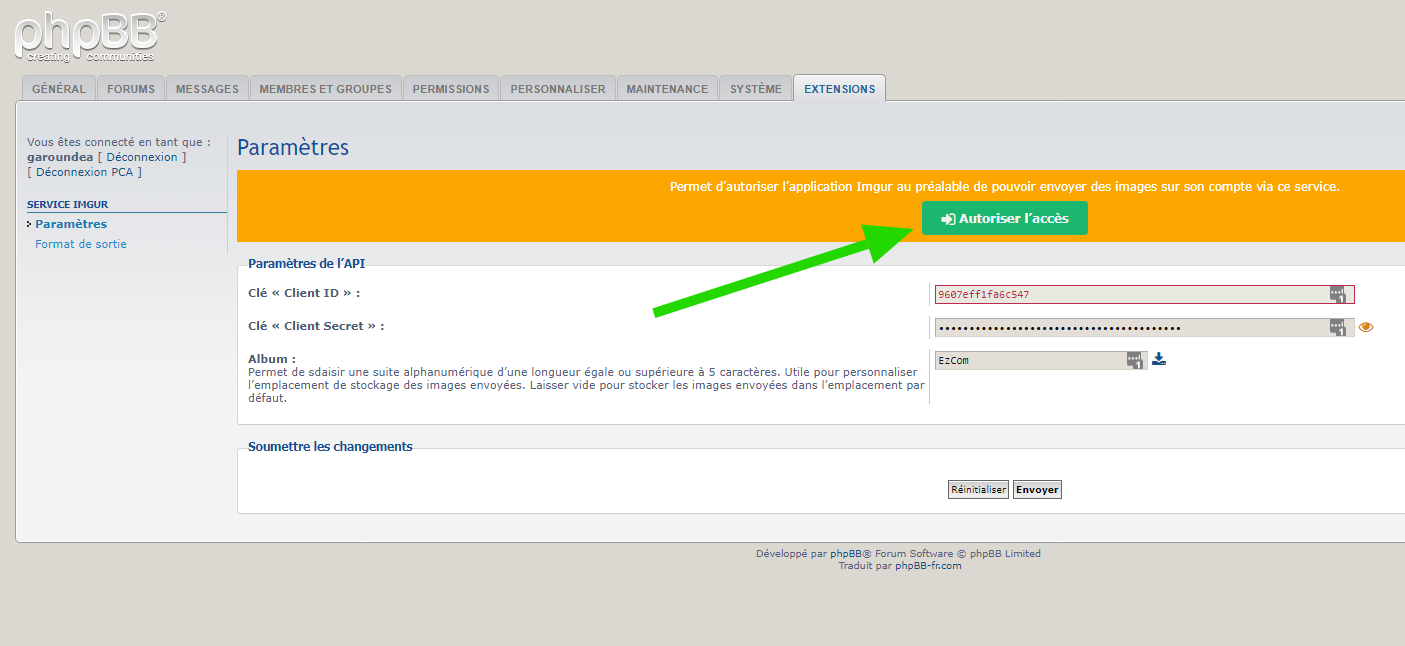 - Paramètres de l’extension - Autorisation de l’application Imgur :