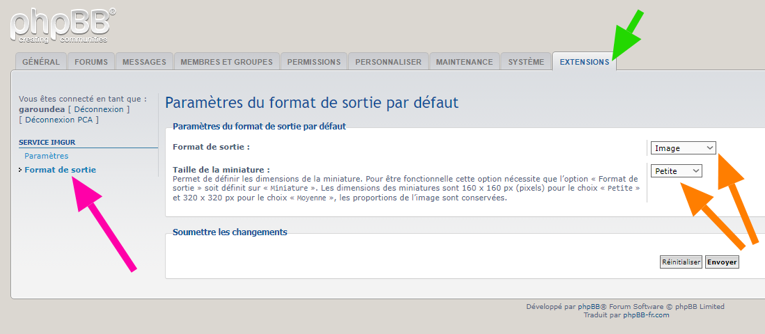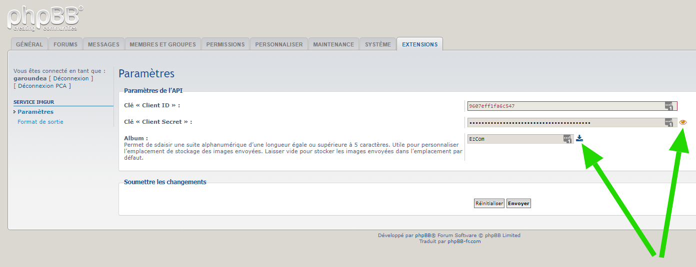 - Description : Cette extension pour phpBB 3.2.x permet d’envoyer des fichiers image vers le service « Imgur » afin de les insérer dans les messages. Plusieurs types de formatage sont proposés, tels que le lien brut vers l’image, le lien mis entre les balises du BBCode URL, du BBCode IMG ou la combinaison des deux.