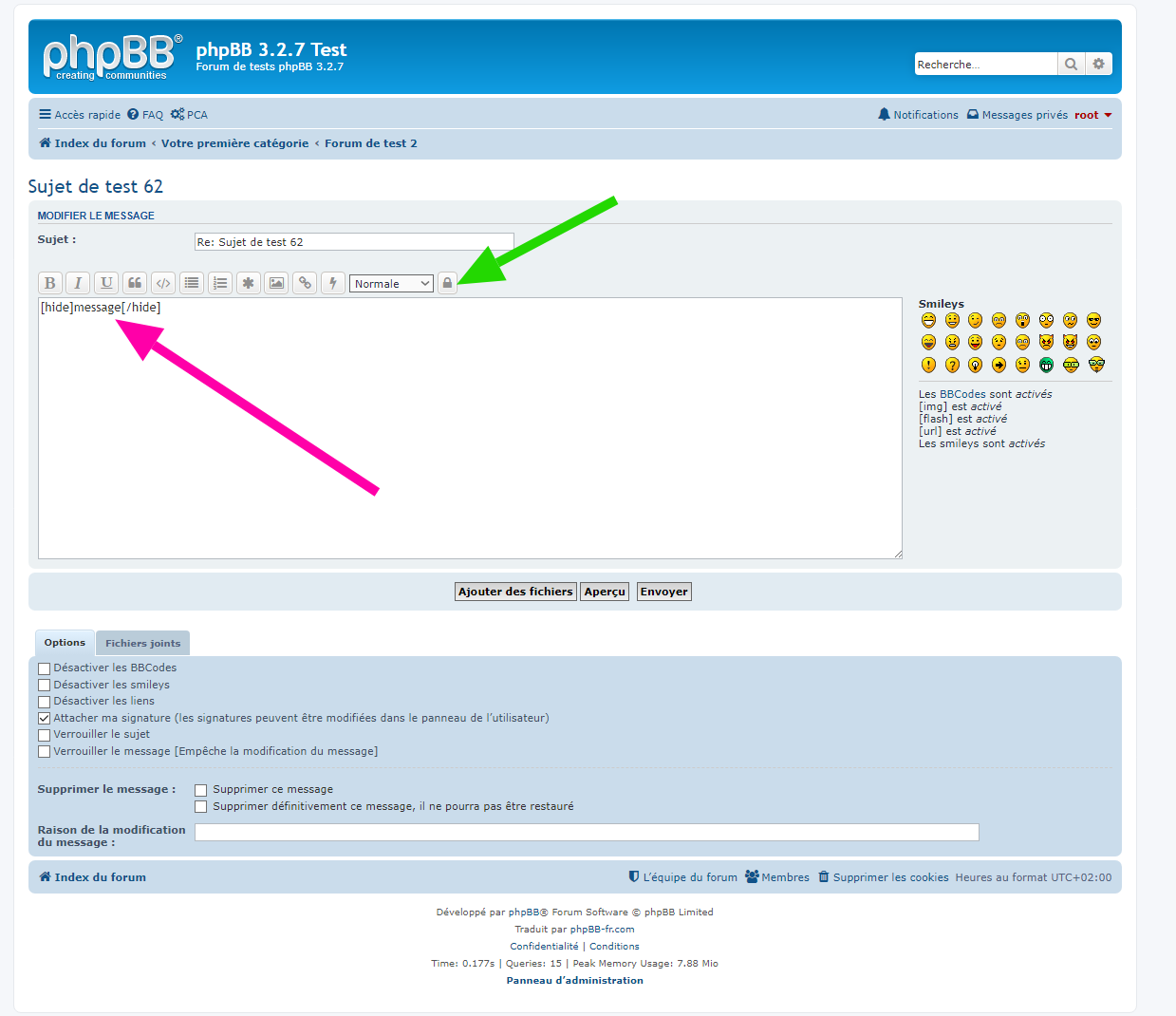 - Vue de la page de l’éditeur complet - Utilisation du BBCode Hide :