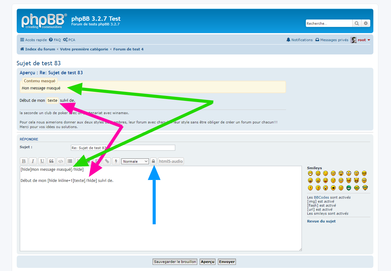 Pour ta question quant à la condition de répondre, j’ai partagé des pistes à tester dans le viewtopic.php?p=5347#p5347. Aussi, le fait est que d’autres forums phpBB utilise la fonctionnalité de masquer tout ou partie d’un texte consultable en y répondant ce n’est sûrement pas sur la dernière version de phpBB 3.2.x, mais qui sait des modifications personnelles en ce sens ont pu être effectuées.