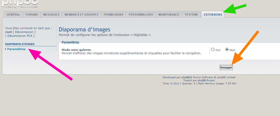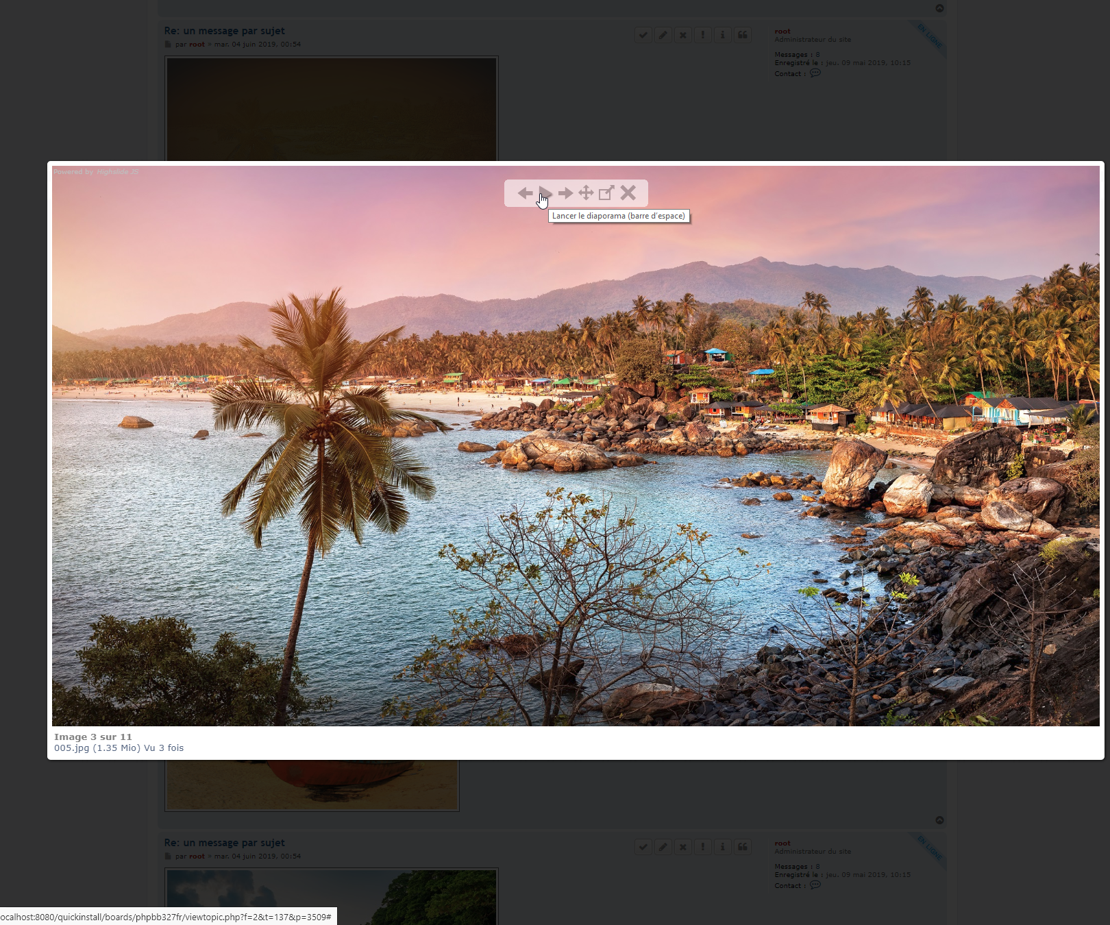 - Description : Cette extension pour phpBB 3.1.x & 3.2.x permet d’afficher les images de la page d’un sujet dans une boite en sur-impression des messages dans laquelle il est possib le de lancer un diaporama animé, de naviguer parmi les images au moyen des touches du clavier ou de la souris, d’afficher l’image dans ses dimensions originales, de naviguer au moyen des miniatures de toutes les images de la page. Les image en fichier joint et mises entre les balises du BBCode IMG sont compatibles.