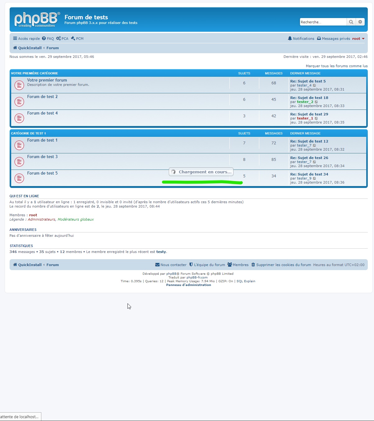 - Vue de la page de l’index du forum, affichage de l’indicateur de chargement de la page :