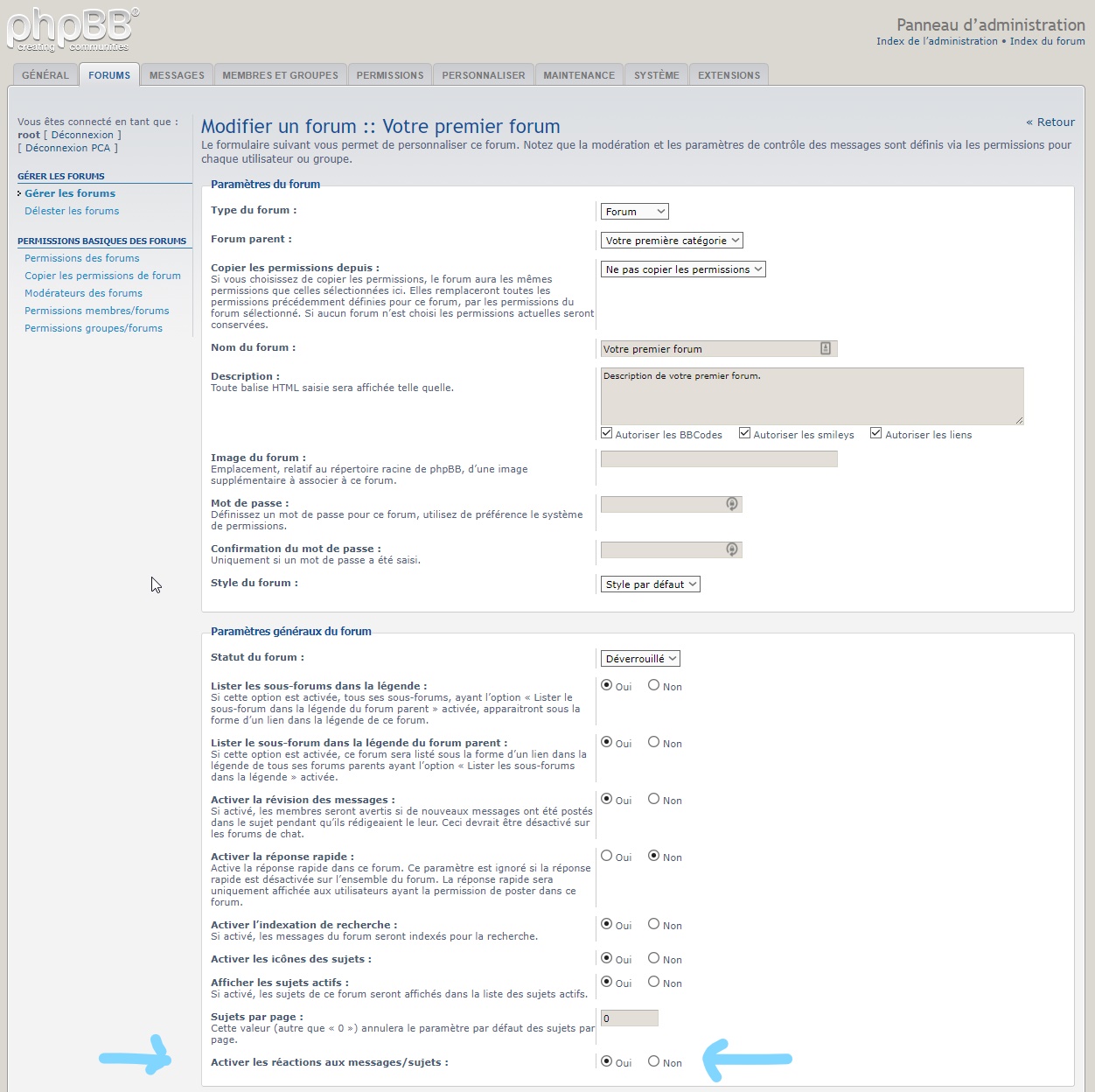 - Page de gestion d’un forum, activation de la fonctionnalité propre aux réactions des messages/sujets :