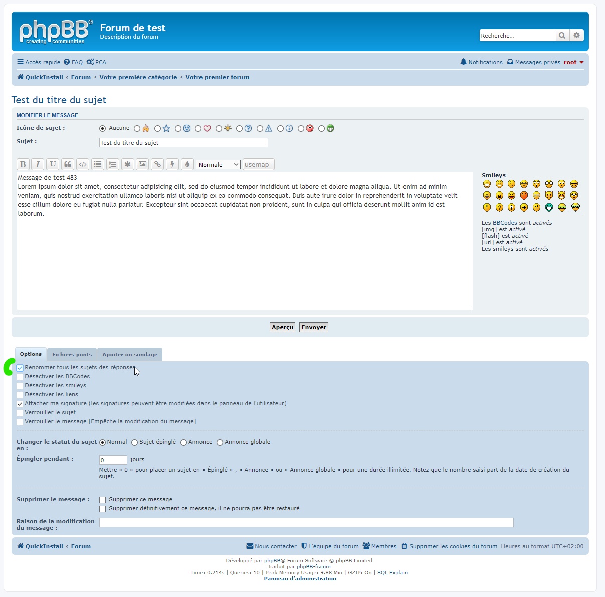 - Il n’est pas obligatoire de modifier le sujet (titre) du premier message pour mettre à jour le sujet (titre) de toutes ses réponses, seulement de valider le bouton « Envoyer » en étant sur la page de l’éditeur complet du premier message ;