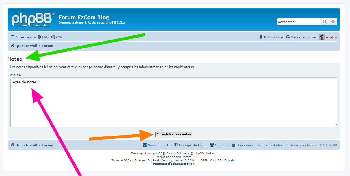 Met à disposition une page de rédaction de ses notes pour les sauvegarder | Allows to edit and save own notes for phpBB forums.