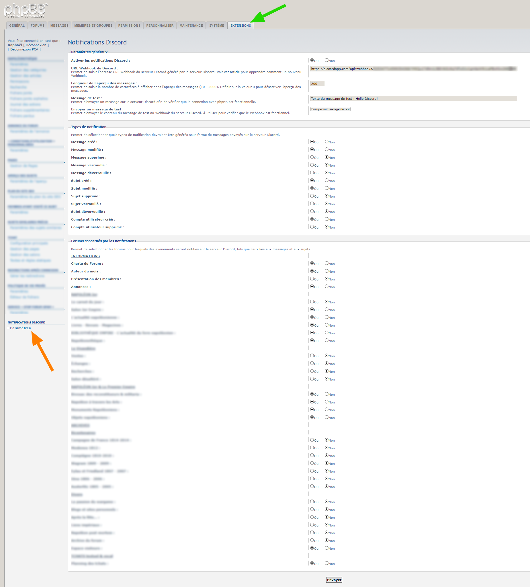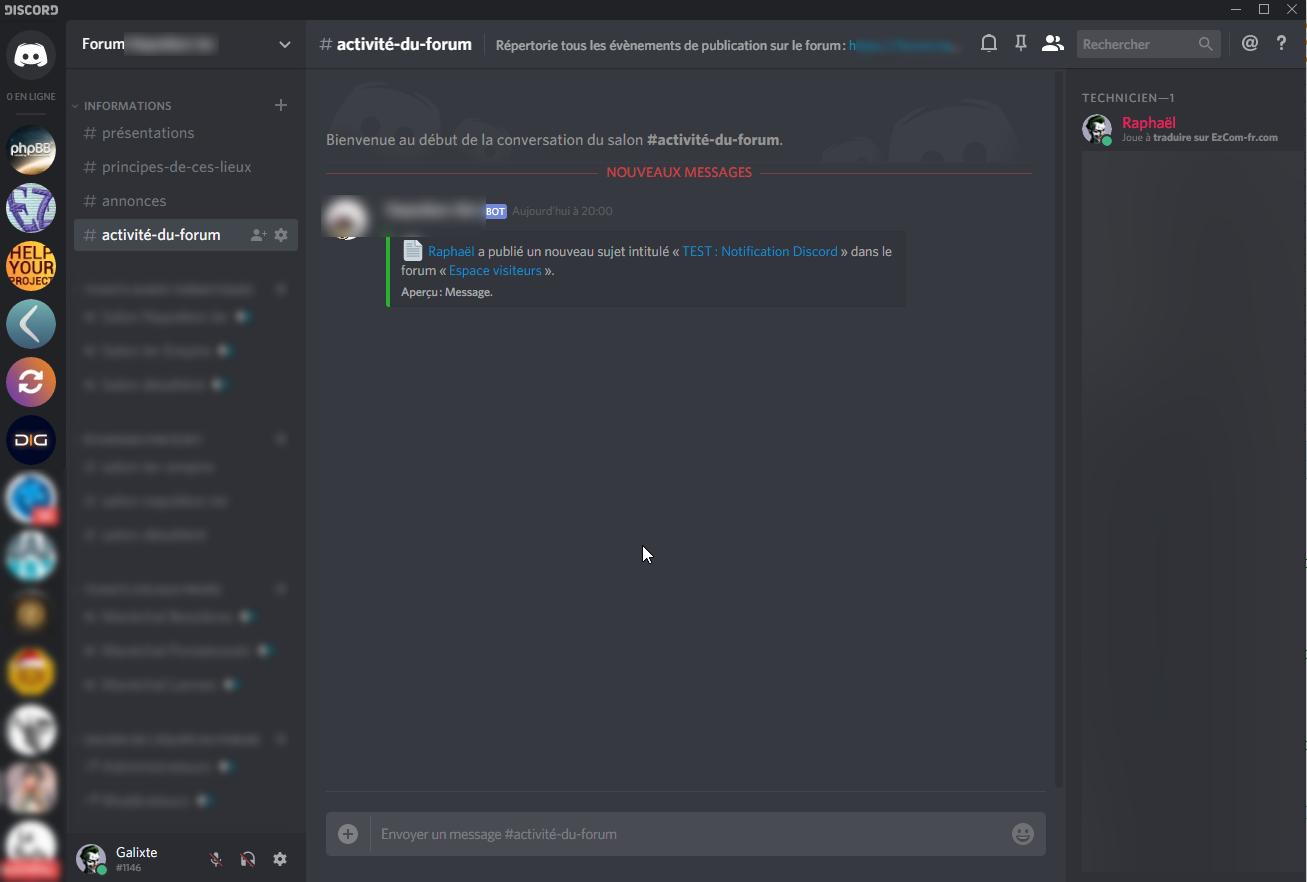 - Description : Cette extension pour phpBB 3.2.x permet d’envoyer des notifications sur un serveur Discord selon certains évènements qui se produisent sur le forum phpBB. La création, modification, verrouillage, déverrouillage et suppression de message et sujet, la création et la suppression de comptes utilisateur. Un aperçu du message publié est possible. Chaque forum peut être indépendamment configuré pour faire partie des forums dont leur contenu (message/sujet) seront notifié sur le forum Discord. Il est nécessaire d’obtenir l’URL du Webhook associé au selon de son serveur Discord pour faire fonctionner cette extension, ainsi que d’avoir le module PHP-CURL installé sur son hébergement Web.