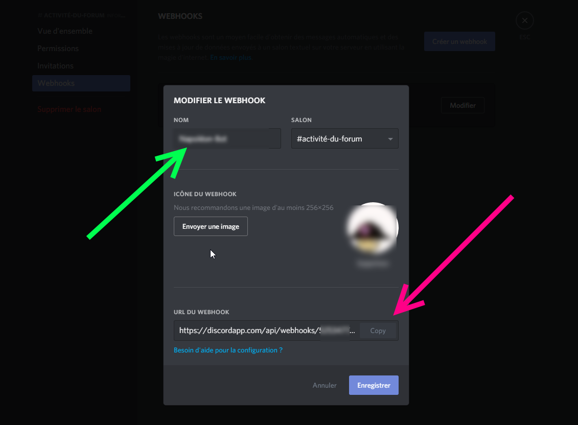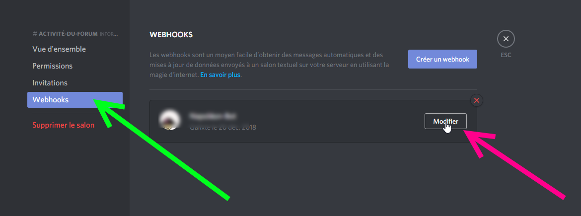 - Se rendre à la configuration du Webhook Discord du salon :