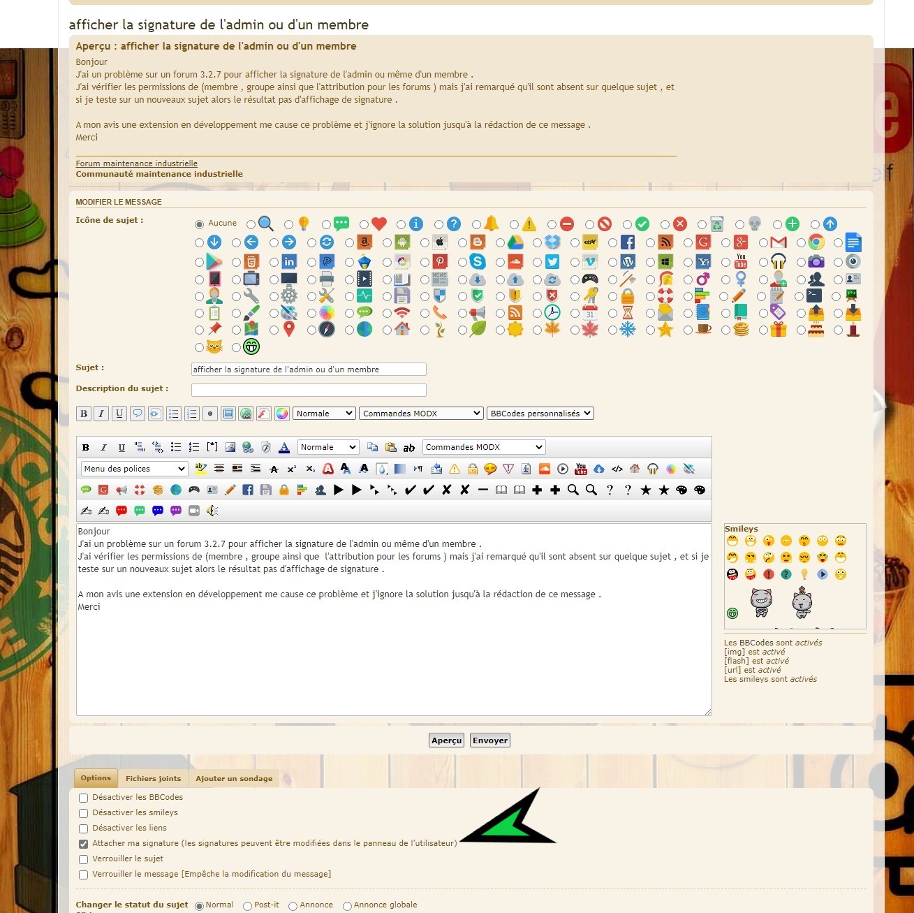 Ma signature comporte un bouton bbcode ajouter depuis une année déjà mais c'est dernièr mois j'ai remarquer que c'est impossible de faire afficher la signature si sur un sujet ni message .