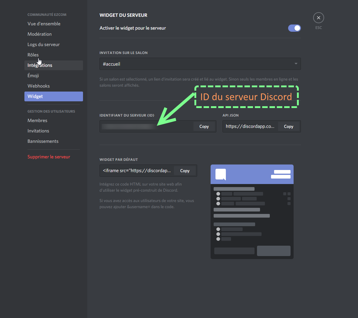 J’ai mis à jour la capture d’écran et j’en ai ajoutée une de la page des paramètres du serveur Discord accessible depuis l’application Discord ou son site Web. Quand tu es sur la page de ton serveur, tu as son nom qui est affiché en haut, tu cliques dessus, tu choisis « Paramètres du serveur », puis tu te rends dans la section « Widget » et là tu te réfères à la capture d’écran que j’ai indiquée.