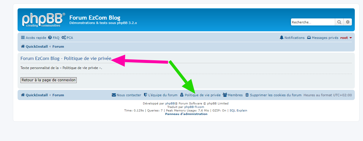 - saisir son texte personnalisé pour la « Politique de vie privée », remplaçant ainsi celui par défaut dans phpBB ;