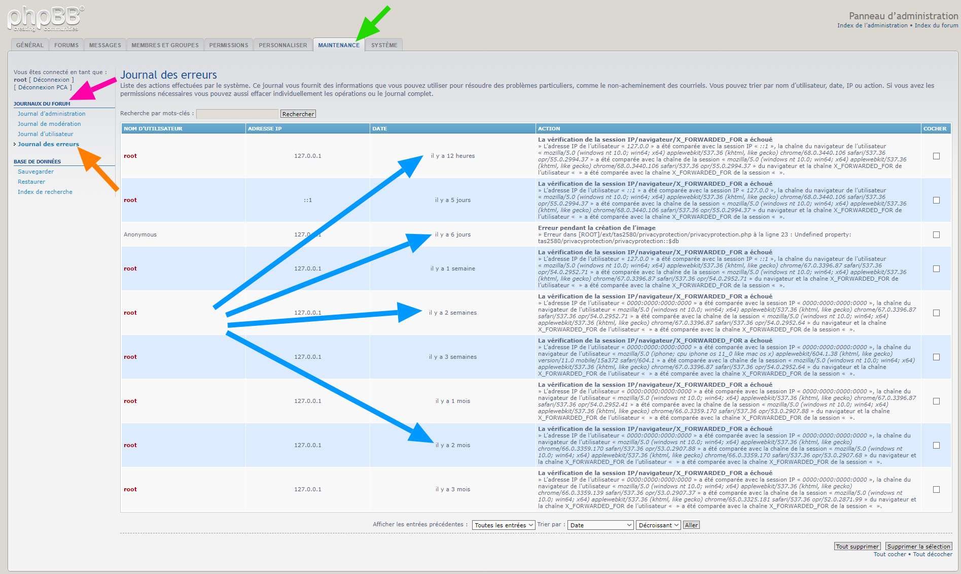 Page du journal des erreurs.