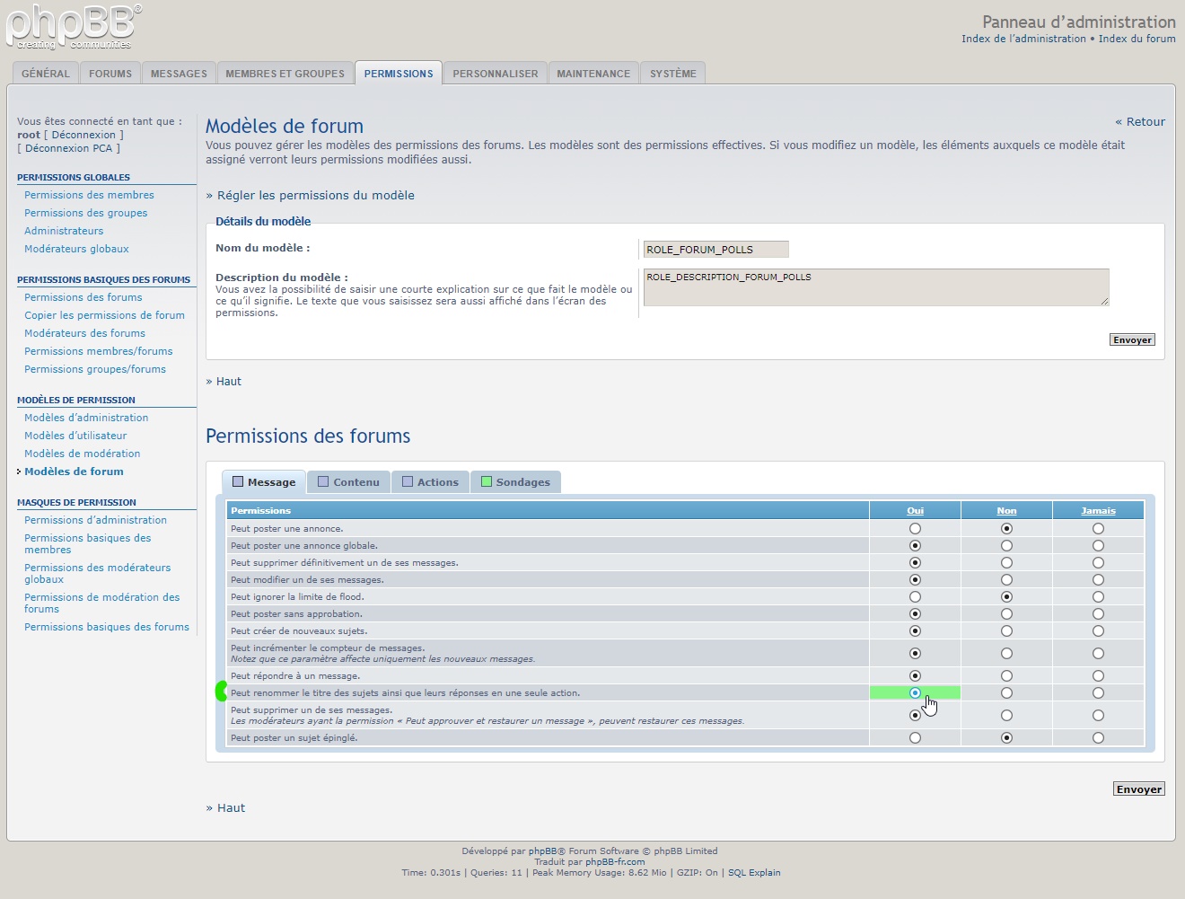 - Une permission est ajoutée dans les « Modèles de forum » permettant de sélectionner quel groupe/utilisateur peut réaliser cette action ;