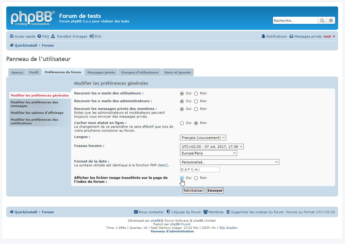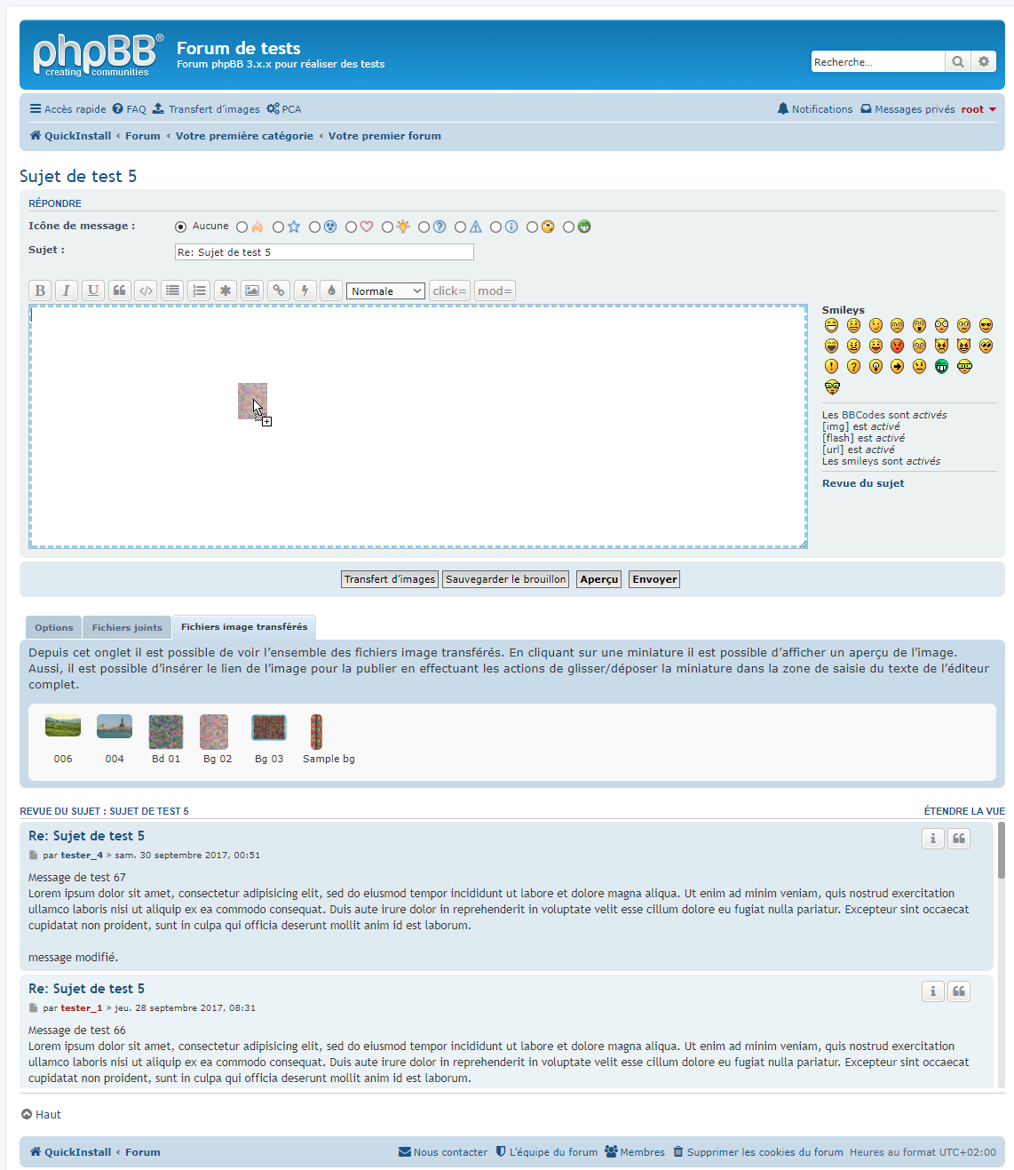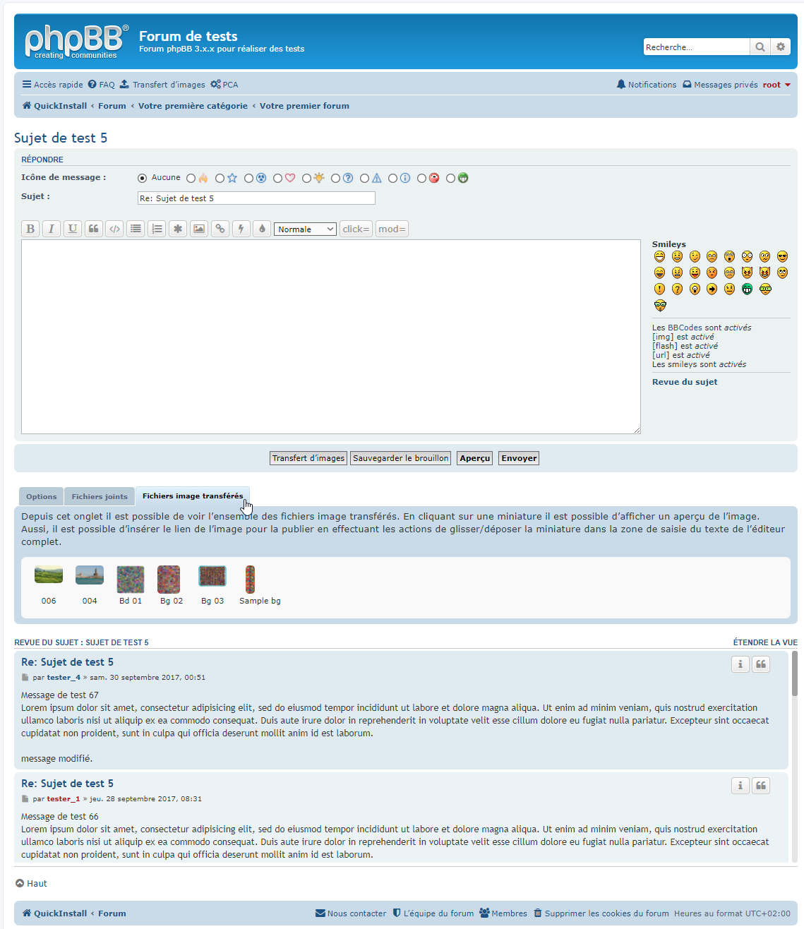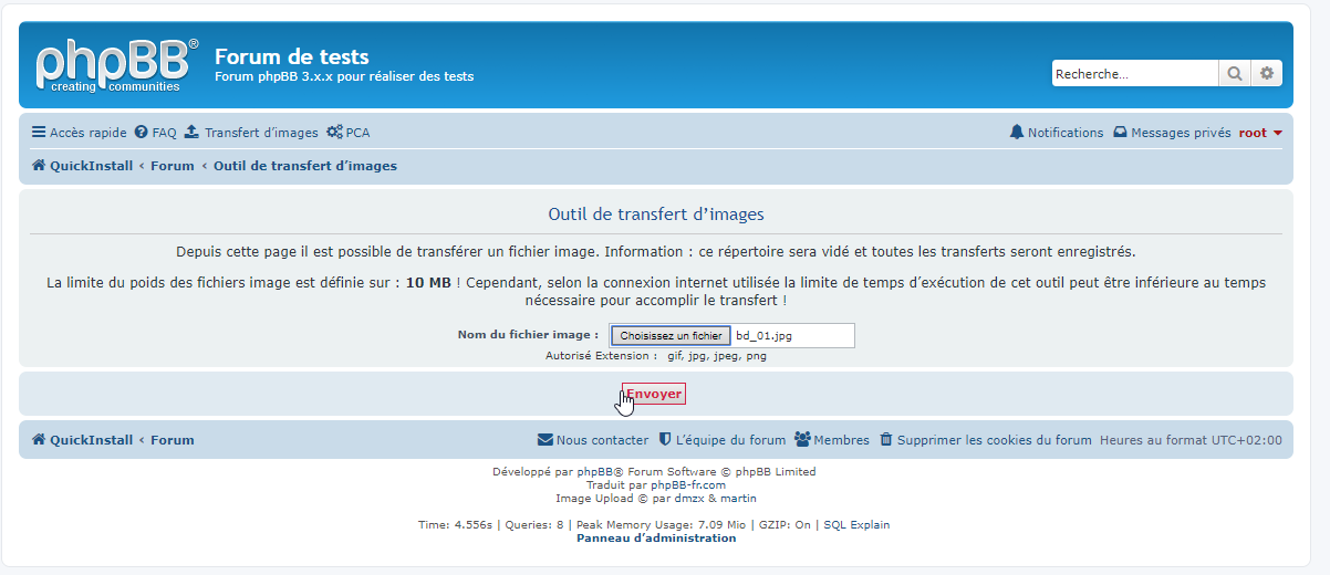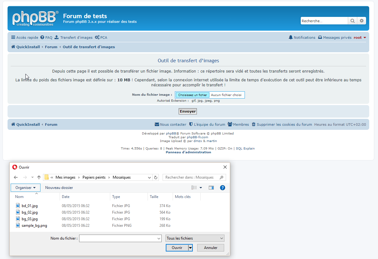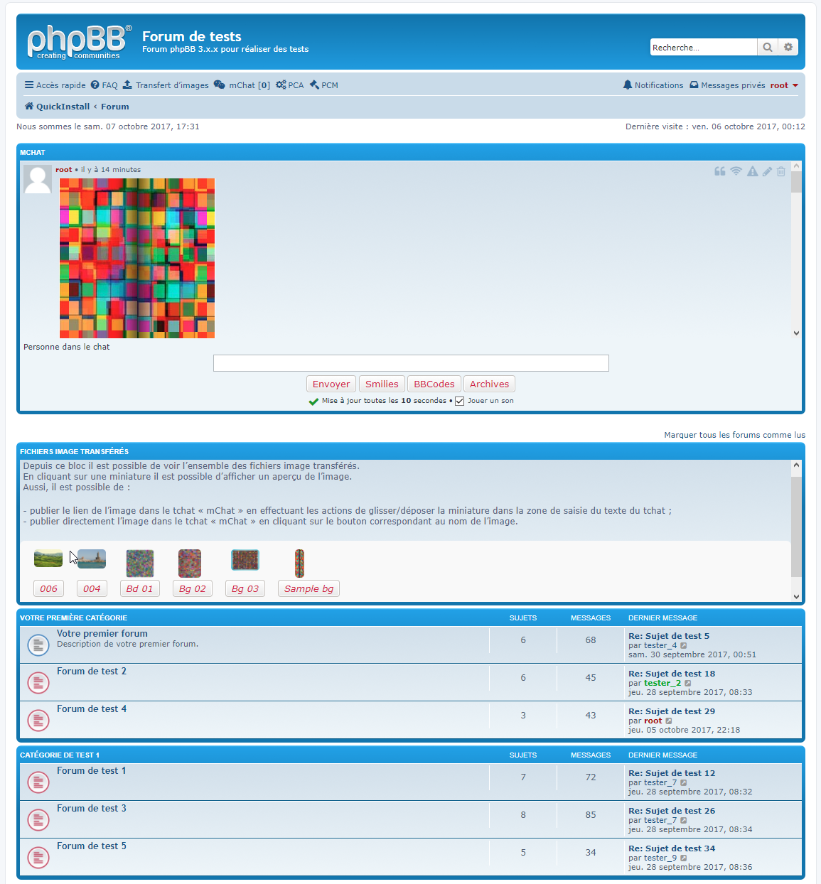 - Description : Cette extension pour phpBB 3.1.x & 3.2.x permet de transférer des images sur le forum qui pourront être insérées dans les messages et dans le tchat de l’extension « mChat ». Voir un exemple sur la page du forum de l’auteur (forum en anglais, il est nécessaire d’être connecté).