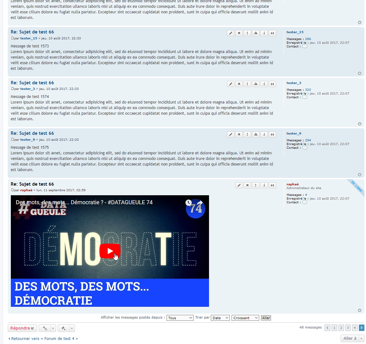 - Vue la page d’un sujet, le lien intégré affiche le contenu de la vidéo :