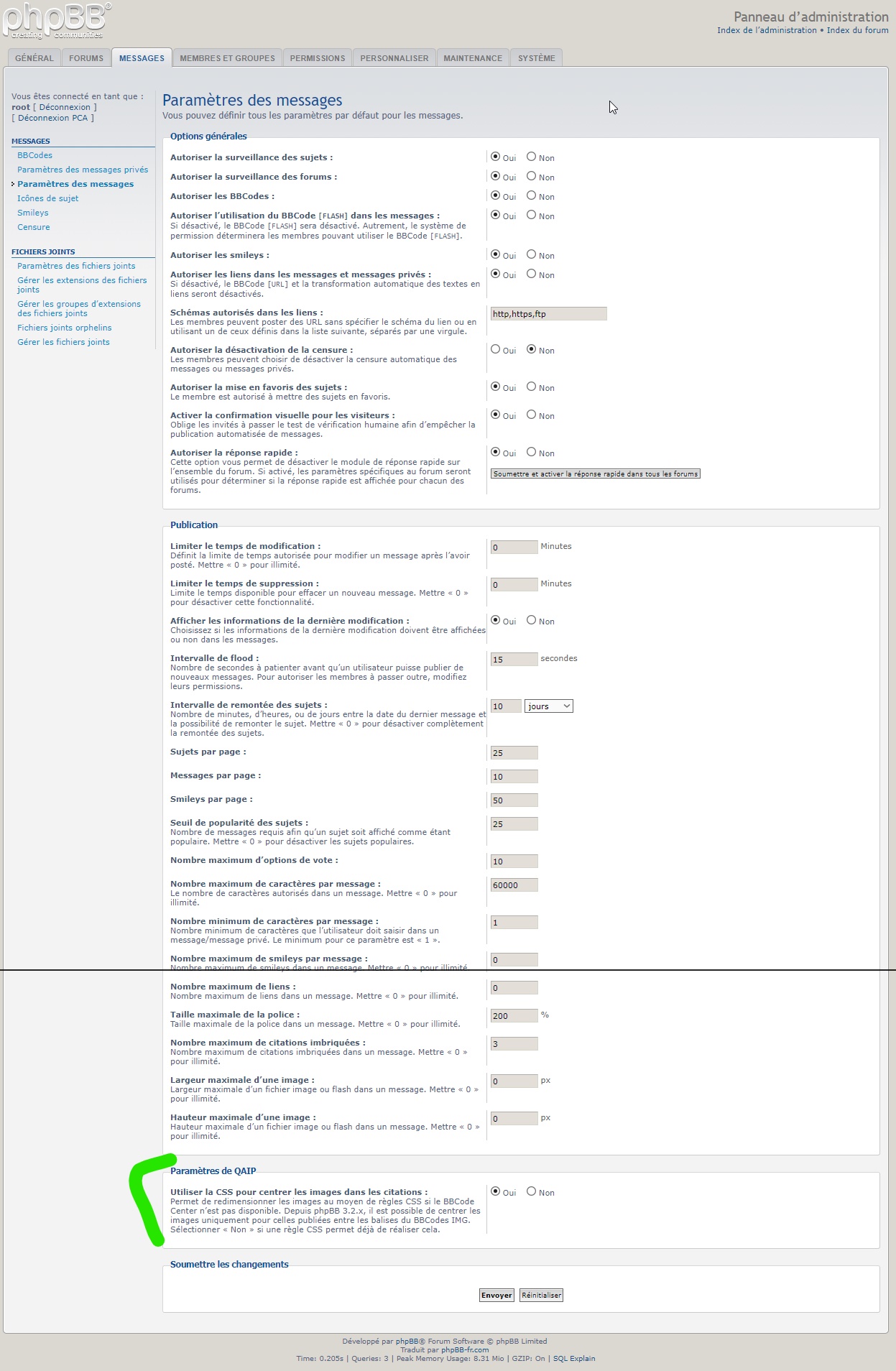 - Page des paramètres des messages, paramètre de l’extension « Quote Attachments Img in Posts » :