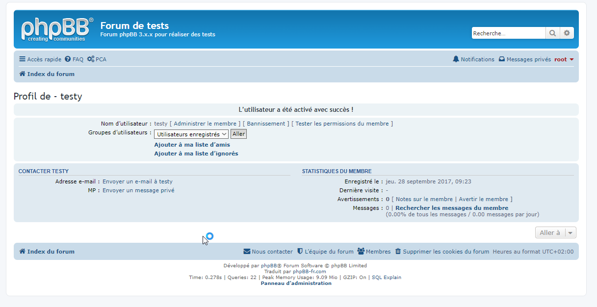 - Vue du profil du compte nouvellement enregistré, la raison de l’activation est affiché, le bouton pour activer le compte est affiché :