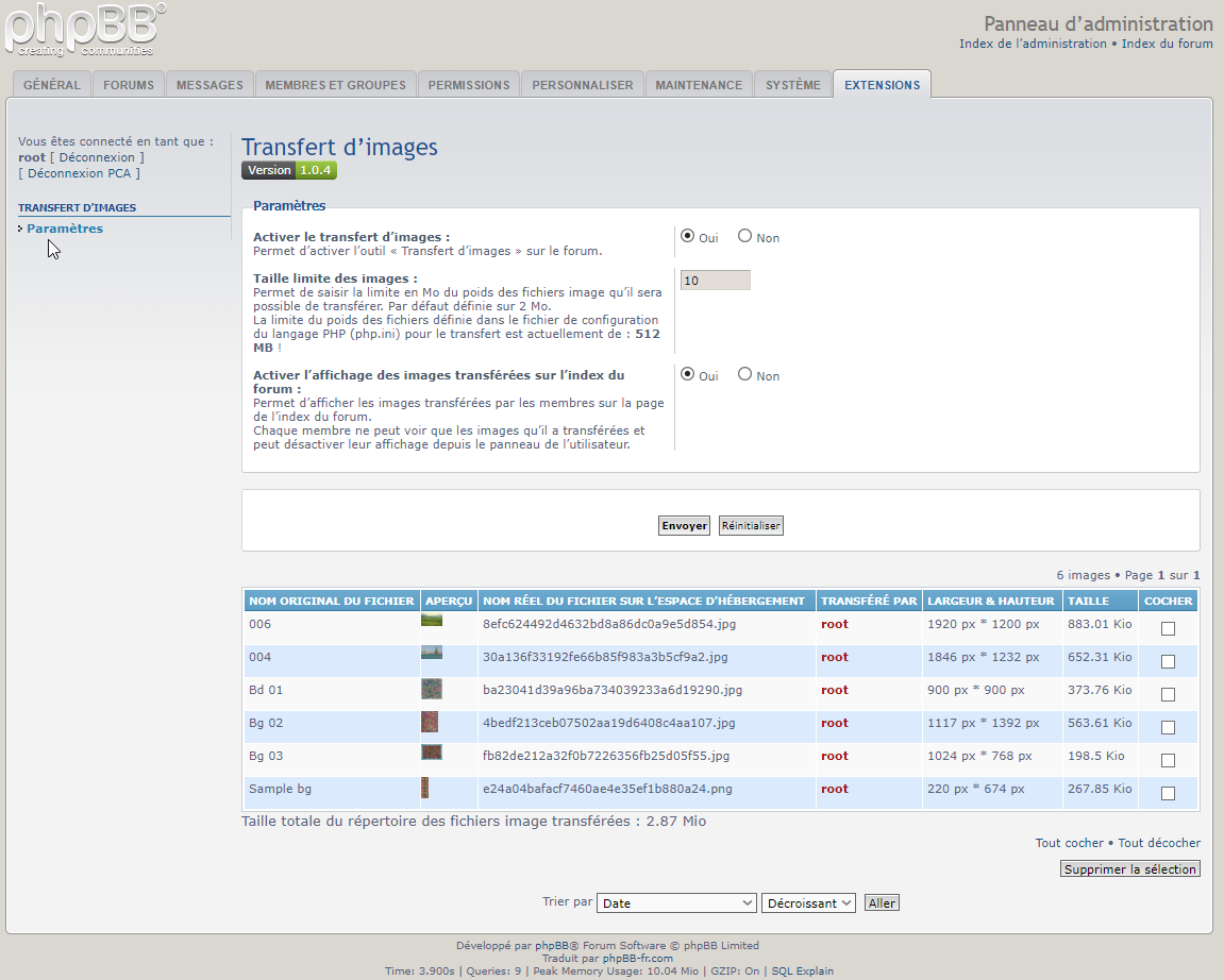 - Description : Cette extension pour phpBB 3.1.x & 3.2.x permet de transférer des images sur le forum qui pourront être insérées dans les messages et dans le tchat de l’extension « mChat ». Voir un exemple sur la page du forum de l’auteur (forum en anglais, il est nécessaire d’être connecté).