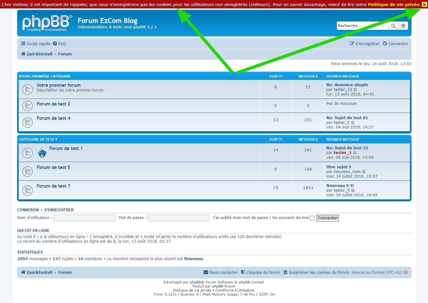 - activer l’affichage des informations sur les cookies. Ainsi, n’importe qui refusant l’enregistrement des cookies pourra prendre connaissance que plusieurs fonctionnalités du forum ne leurs seront pas disponibles. Qui plus est, cette information contient un lien qui les conduira aux paramètres de leurs données personnelles ;