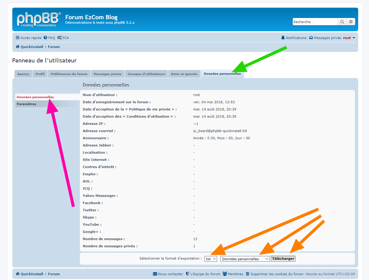 - exporter ses données personnelles, ses messages & ses messages privés envoyés sous forme de fichier CSV ou fichier TXT ;